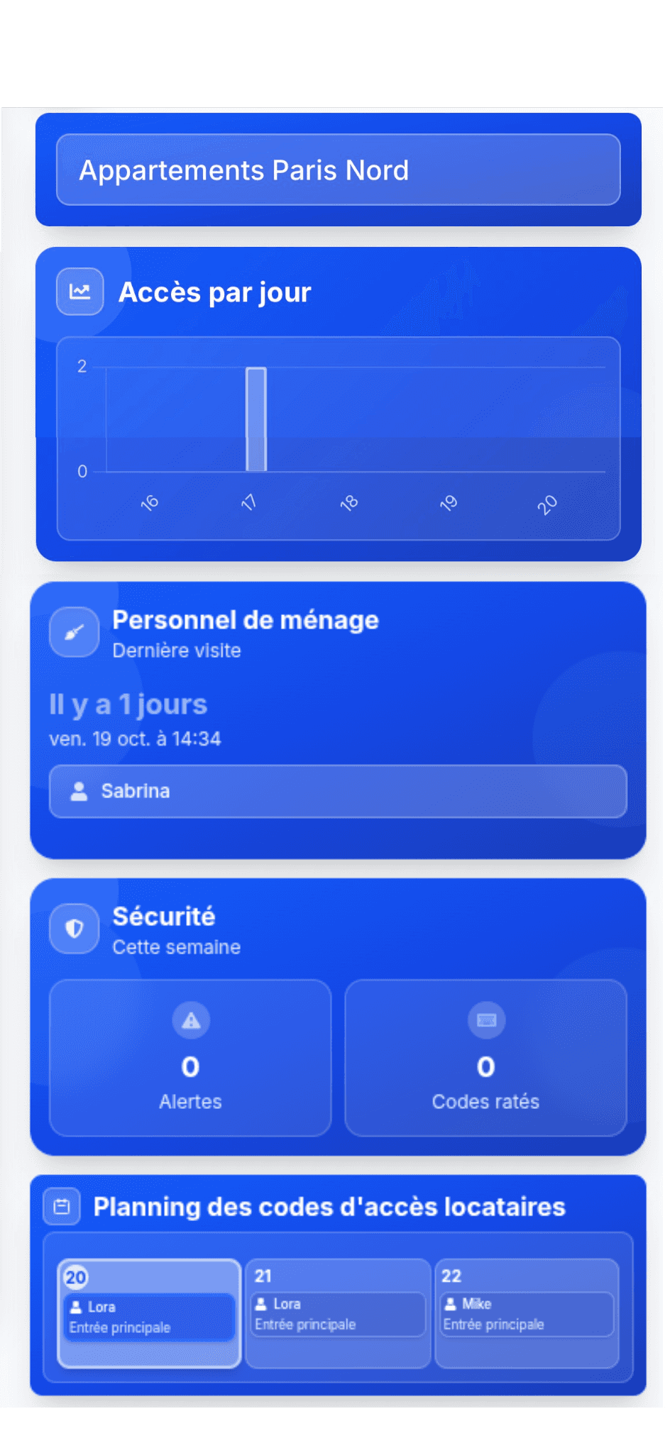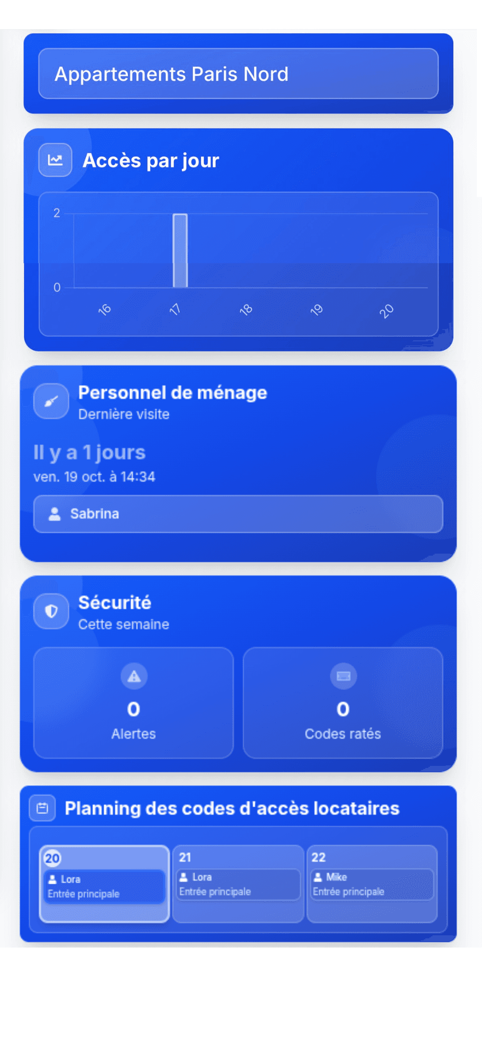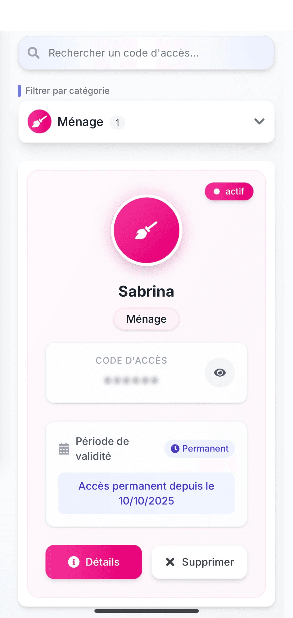 Gérez tous vos accès en un coup d'œil : locataires, personnel de ménage, artisans et famille.